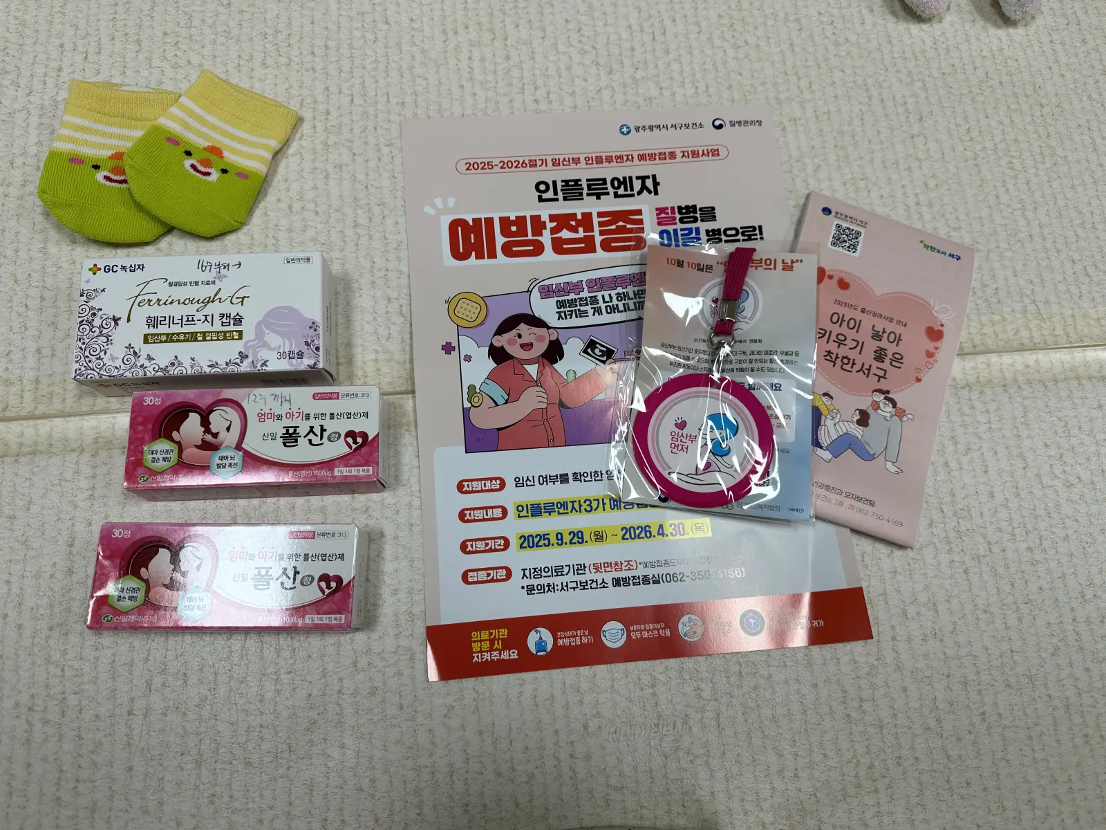5분안에 임산부 등록이 완료되는데요. 16주 이내의 임산부에게 주는 축하선물도 같이 받아왔어요. 선물을 봐보니 엽산 2달분, 철분제 1달분, 임산부 벳지와 아기 양말 등이 포함되 있어요.