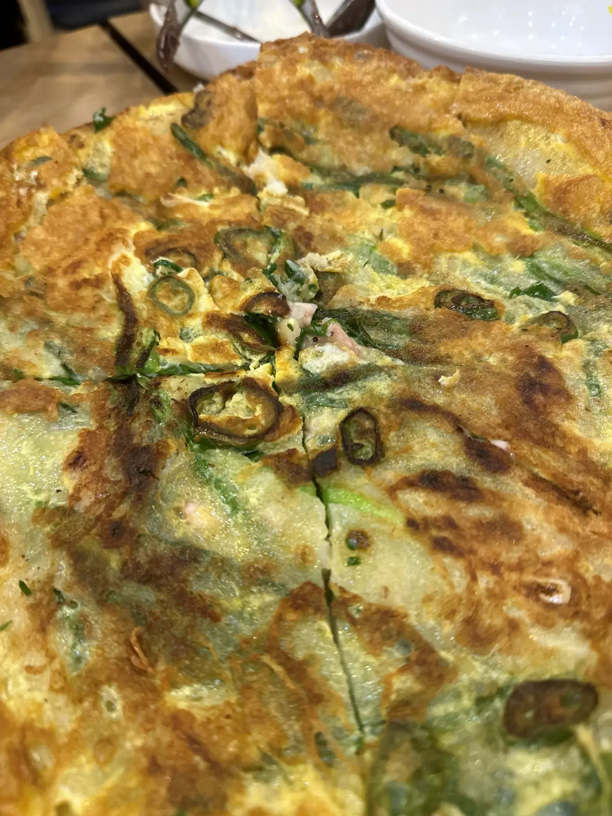 순식간에 다 먹어버려서 저희는 파전도 추가했는데요. 파전에 많은 양은 아니지만 오징어가 송송 썰어서 들어가 있어요. 빈대떡은 바삭하면서 쫄깃한 맛이라면 파전은 약간 찰진 느낌이에요.