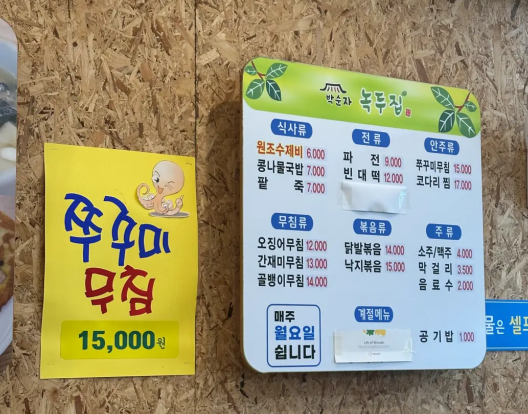 박순자 녹두집 메뉴판