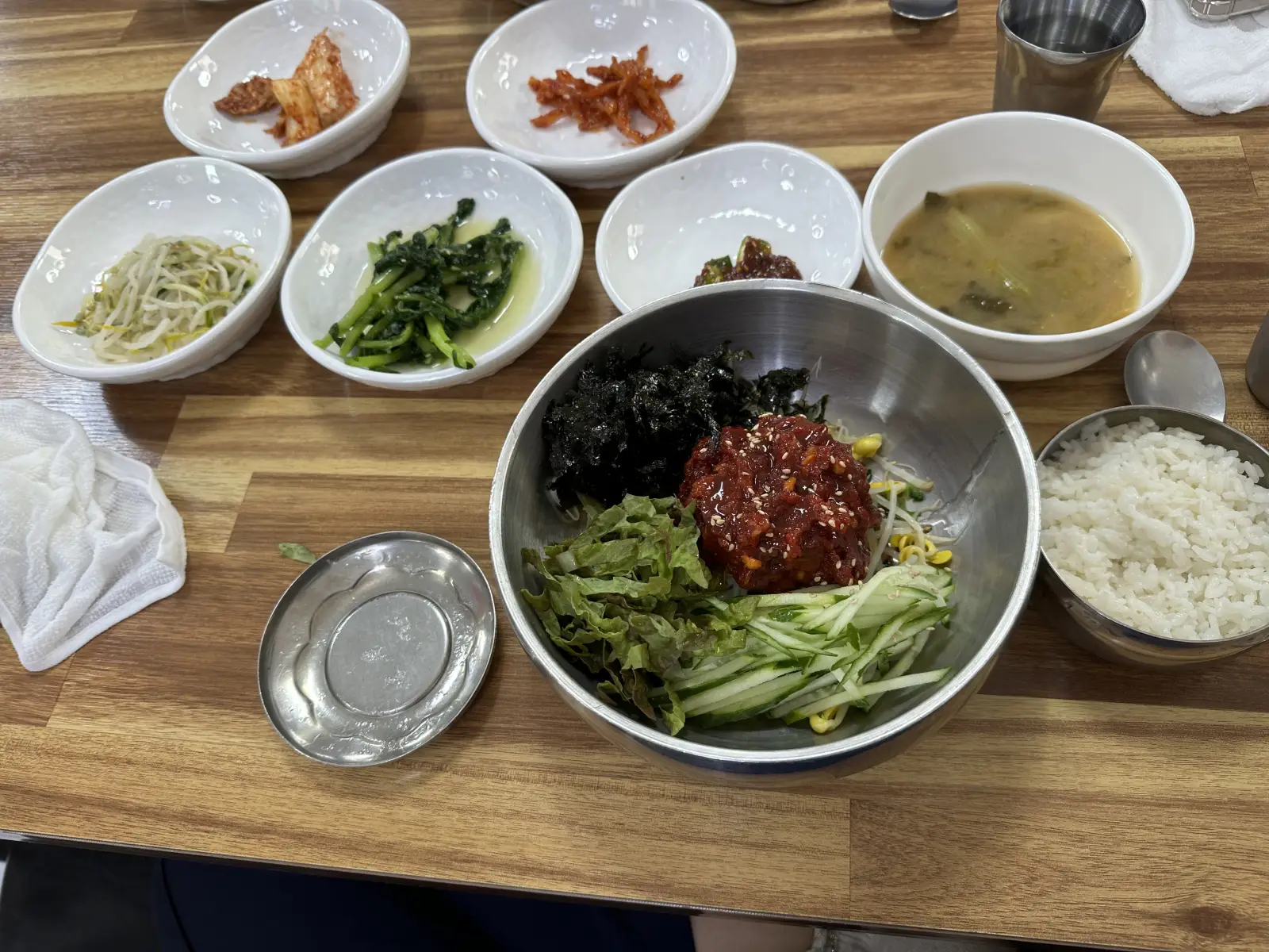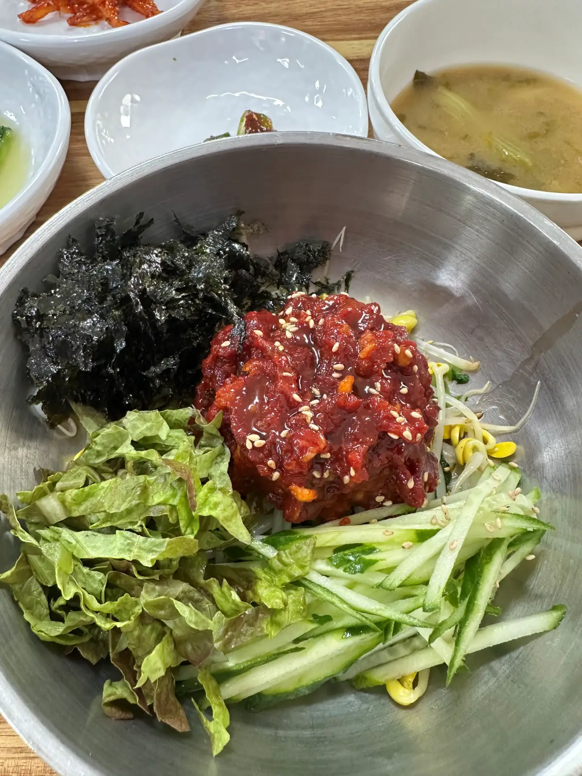 야채도 골고루 있어 잘 비벼주면 한 그릇 뚝딱입니다. 같이나온 된장국도 맛있고요. 항상 다 못먹고 나오는 태홍회관~ 양이 정말 많아요.