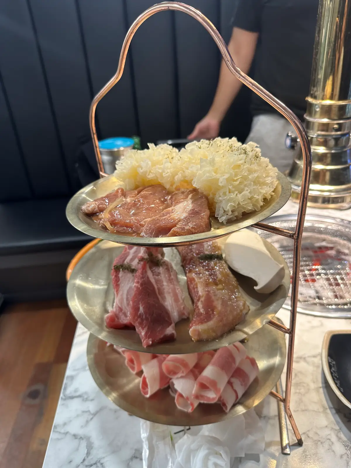 저희는 성인 3. 아이 1 명가서 소반반 모둠세트를 시켰어요. 테이블도 샤브샤브 해 먹을 수 있는 인덕션과 고기를 구울 수 있는 화로가 있어요. 고기의 입장~~ 3단 금색 쟁반에 나와요.