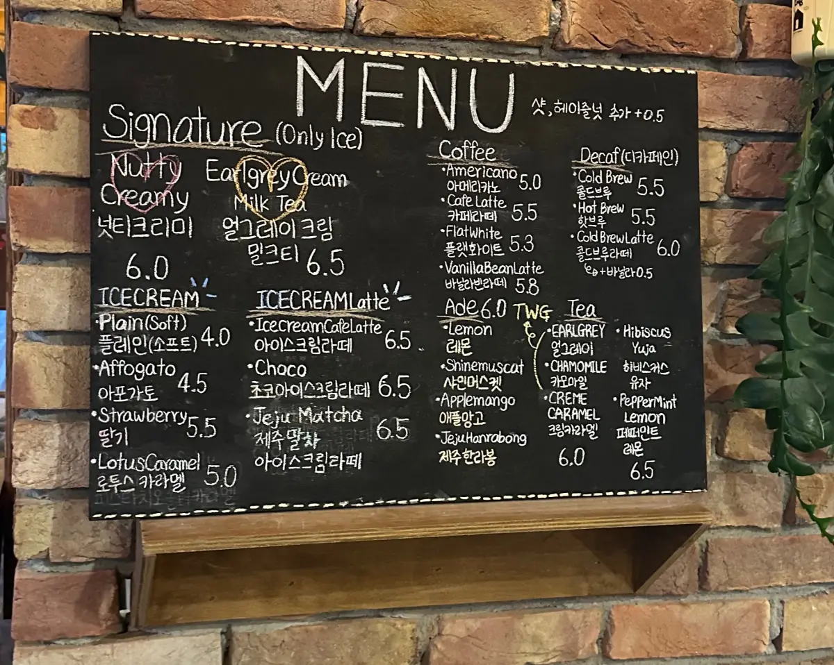 내부는 우드로 되어있어 따뜻한 느낌입니다. 입구 들어가서 메뉴판도 찍어보고요. 시그니처 메뉴인 얼그레이 크림 밀크티와, 카페라테를 시켜보았어요.