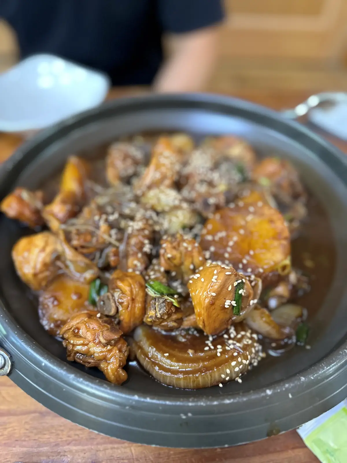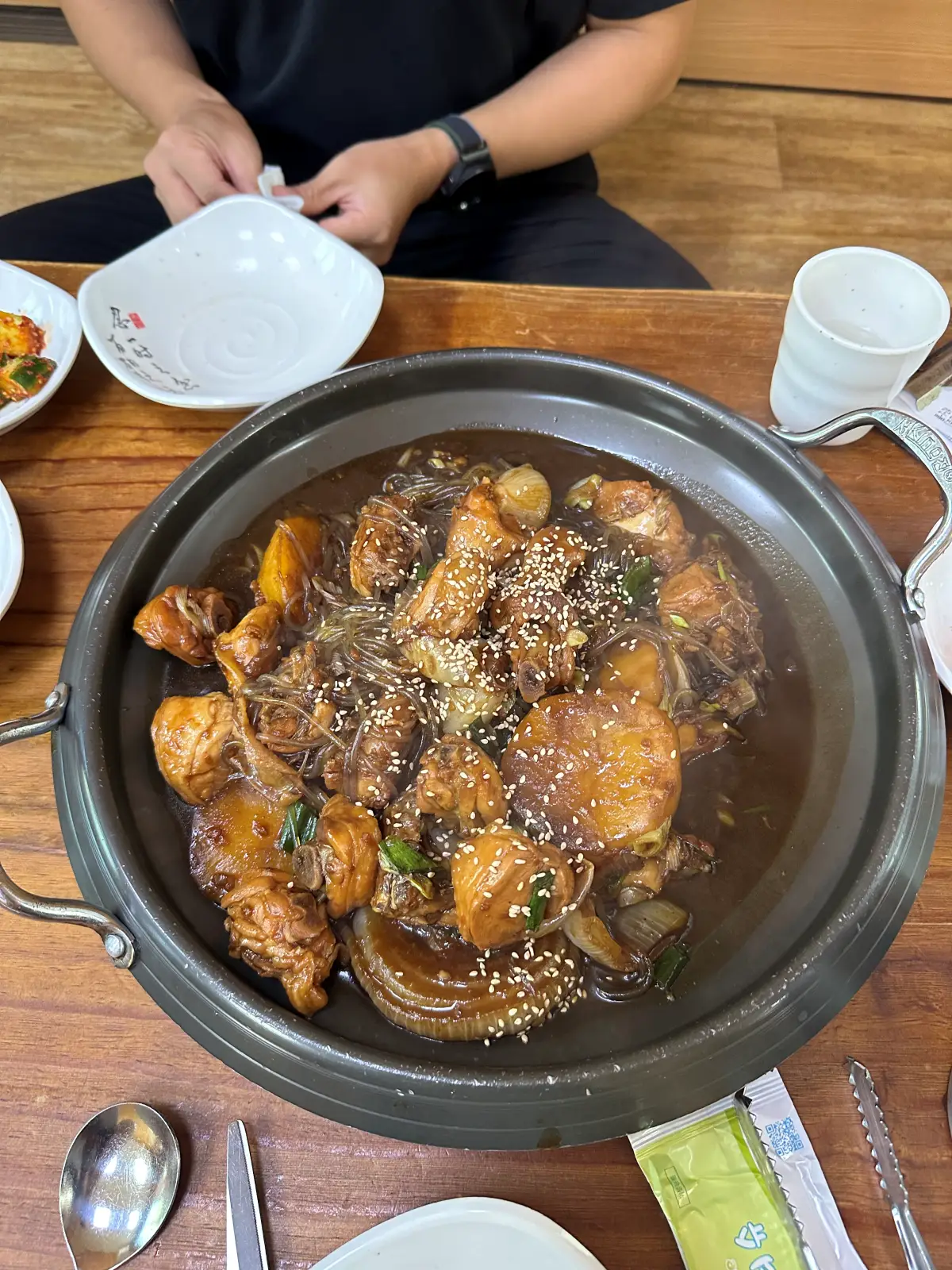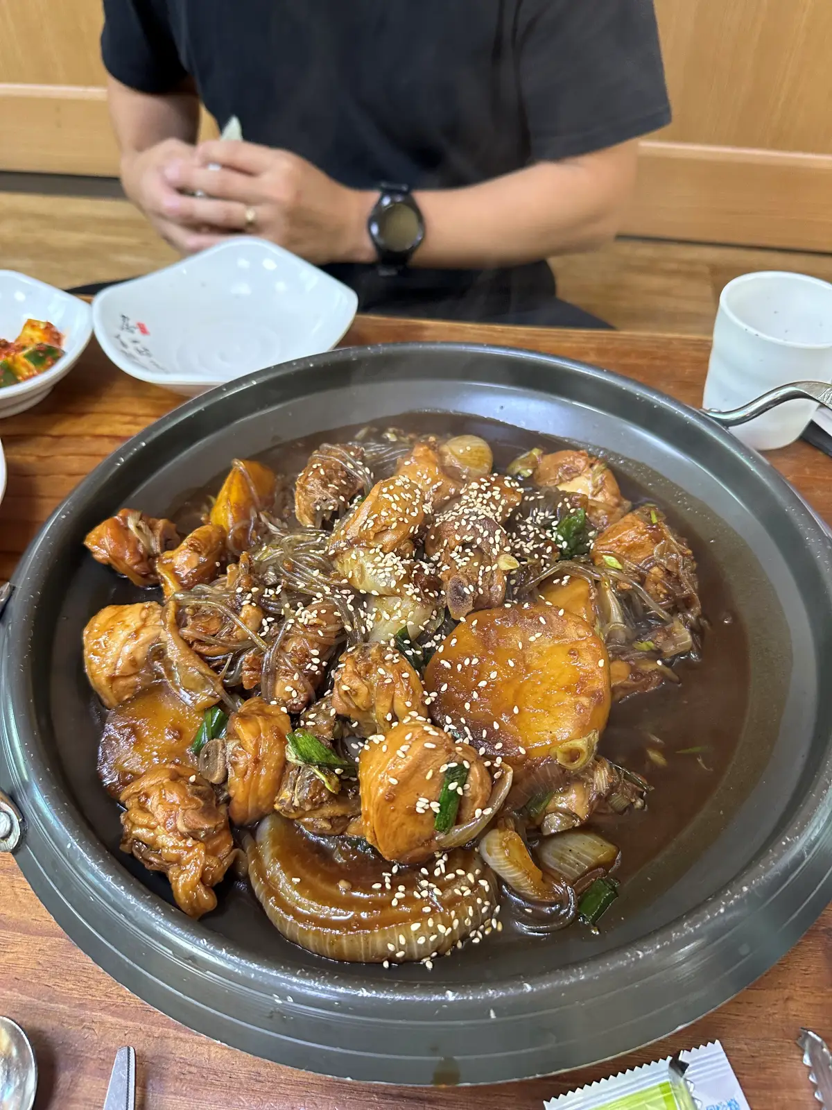 메인 요리인 찜닭인데요. 당면도 적당히 들어가 있고, 감자도 아주 크게 크게 들어가 있어요. 고기도 부드럽고, 조금은 짠듯하지만 자꾸 당기는 맛입니다. 저는 자닮사의 감자가 정말 맛있는 거 같아요. 인물사진으로 찍어봤는데... 흐릿한 저의 찜닭 사진이네요.ㅎㅎ