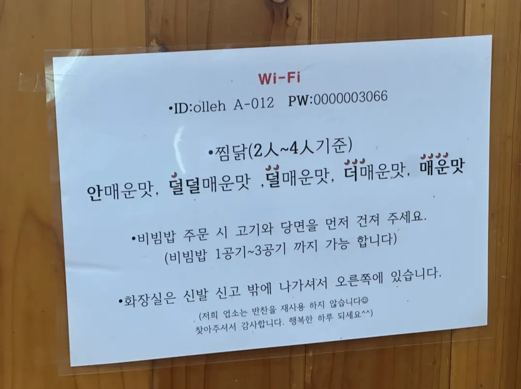 찜닭 가격은 35000원이고, 맛은 5단계로 나눠져 있어요. 오늘은 3살 아이와 같이 방문예정이라 찜닭 안 매운맛으로 시켰는데요. 저는 보통 덜 매운맛으로 먹었던 것 같아요. 그것도 아주 맵지는 않고, 적당히 칼칼한 정도입니다.