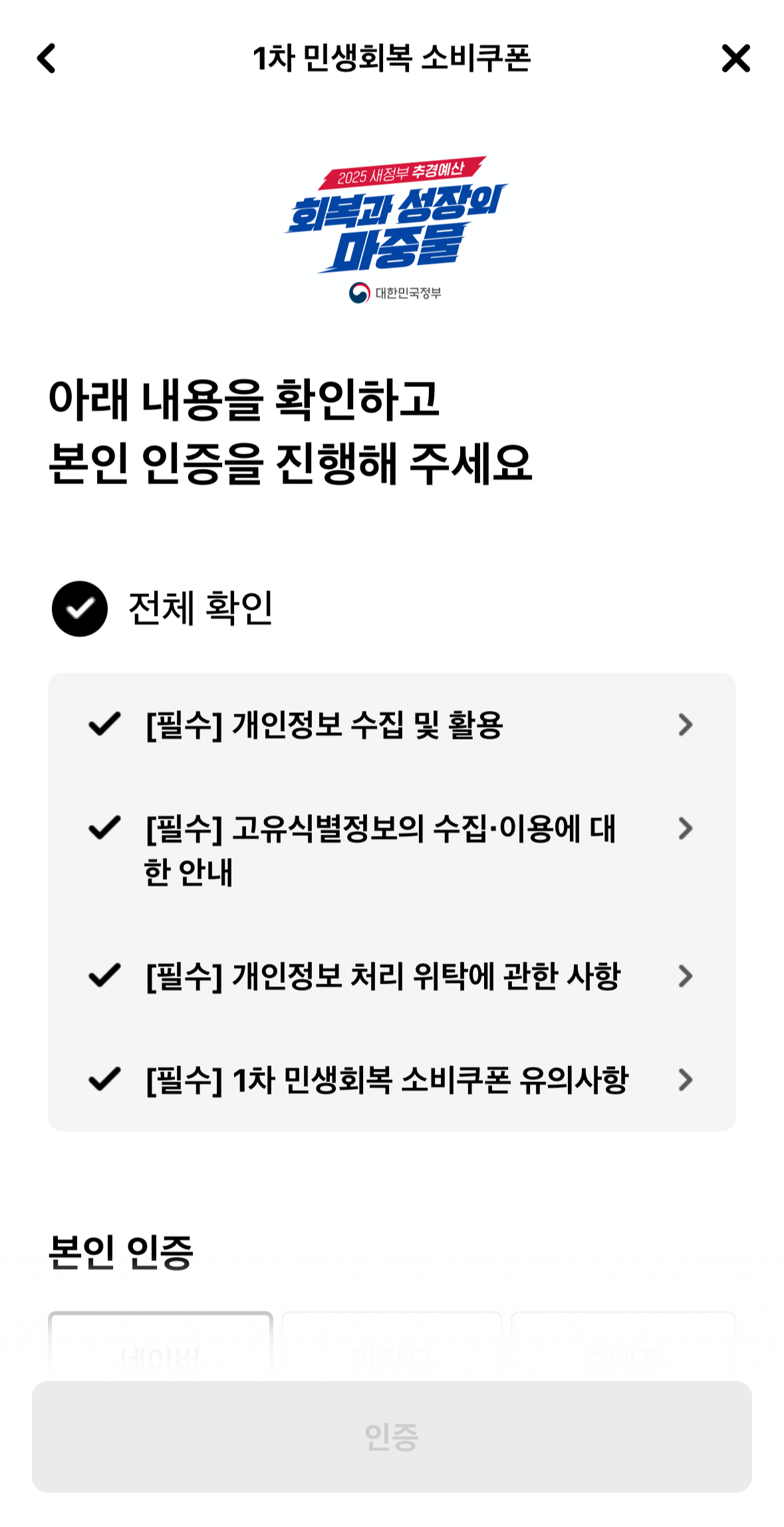 왼쪽 상단의 메뉴 바를 누르고, 민생 회복 소비쿠폰을 눌러줍니다.