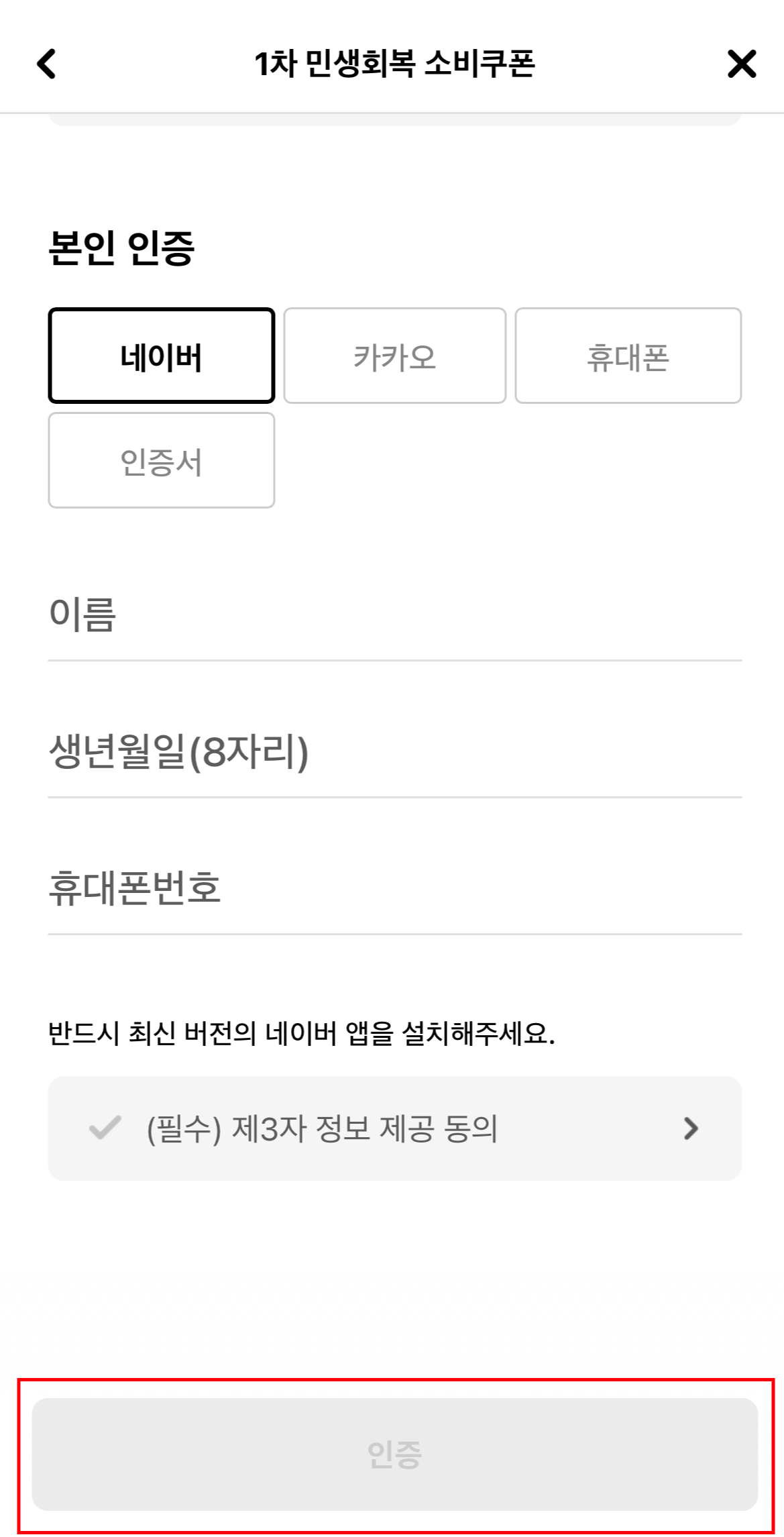 신청하기 버튼을 눌러주고 약관에 동의한 다음 인증을 위해 인적사항을 적어줍니다.