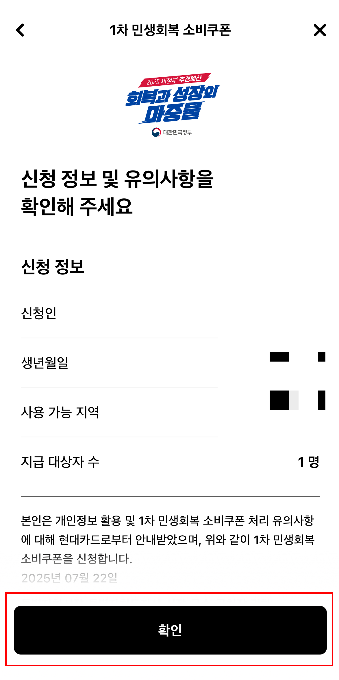 신청인 정보를 확인하고, 사용가능 지역과 지원금을 확인합니다. 맞다면 확인버튼을 누르면 끝!!
