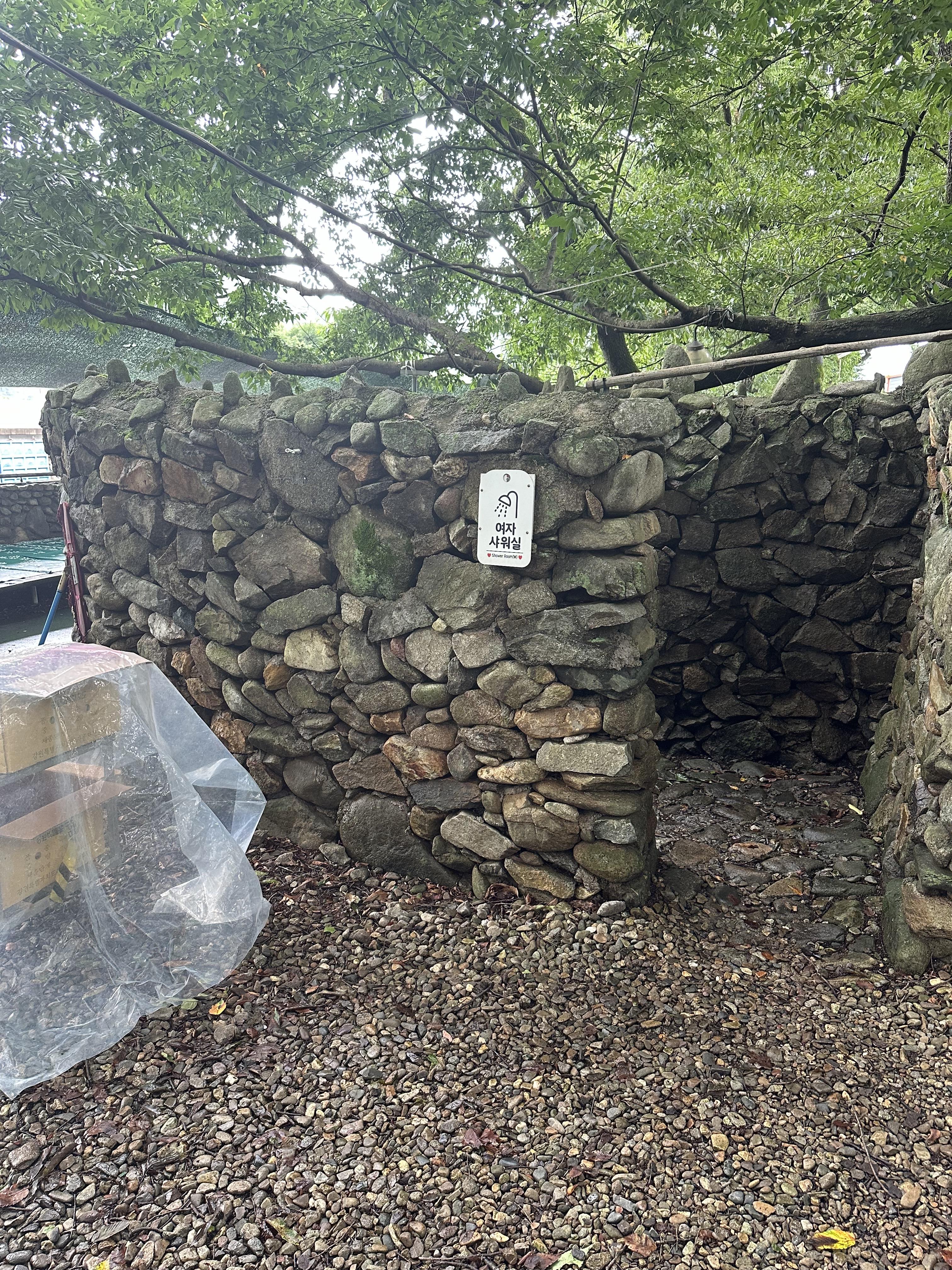 취사도 가능해 평상만 대여한다면, 가족 여러 명이 와도 좋을 것 같았어요. 샤워실도 뭔가 제주도 느낌이 나는 돌담장이 있는 샤워장이고요. 여자 샤워장은 윗부분이 가려져 있어요.