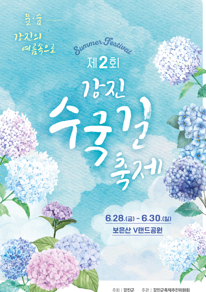 2회 차를 맞은 강진 수국길 축제입니다. 아직 많은 분들에게 알려져 있진 않는데요. 화훼농가로부터 무상 기증받아 구성된 강진읍 고성사, 금곡사, 보은산 등산로를 중심으로 총 8km에 달하는 수국 꽃 길을 관광 상품화 하고 지역 브랜드를 콘텐츠화하는 축제입니다.