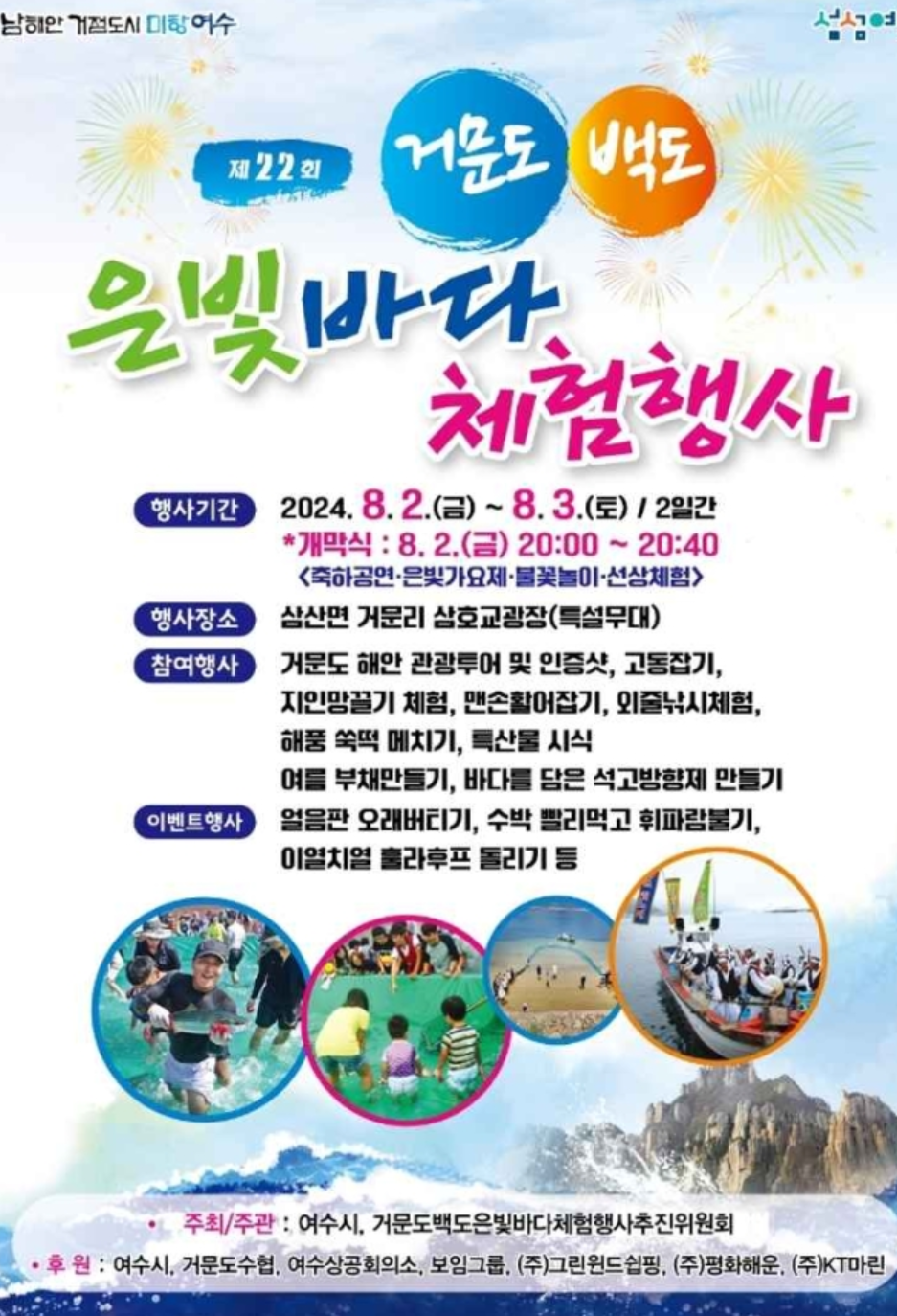 여수 거문도백도은빛바다에서 체험 행사가 개최되는데요. 손활어잡기, 외줄 낚시 체험 등 가족이 함께 즐길 수 있는 체험행사가 준비되어 있다고 합니다. 싱싱한 해산물과 함께 쑥 체험도 가능하다고 하니 여수여행할때 한번 들려보는것도 괜찮을것 같아요.