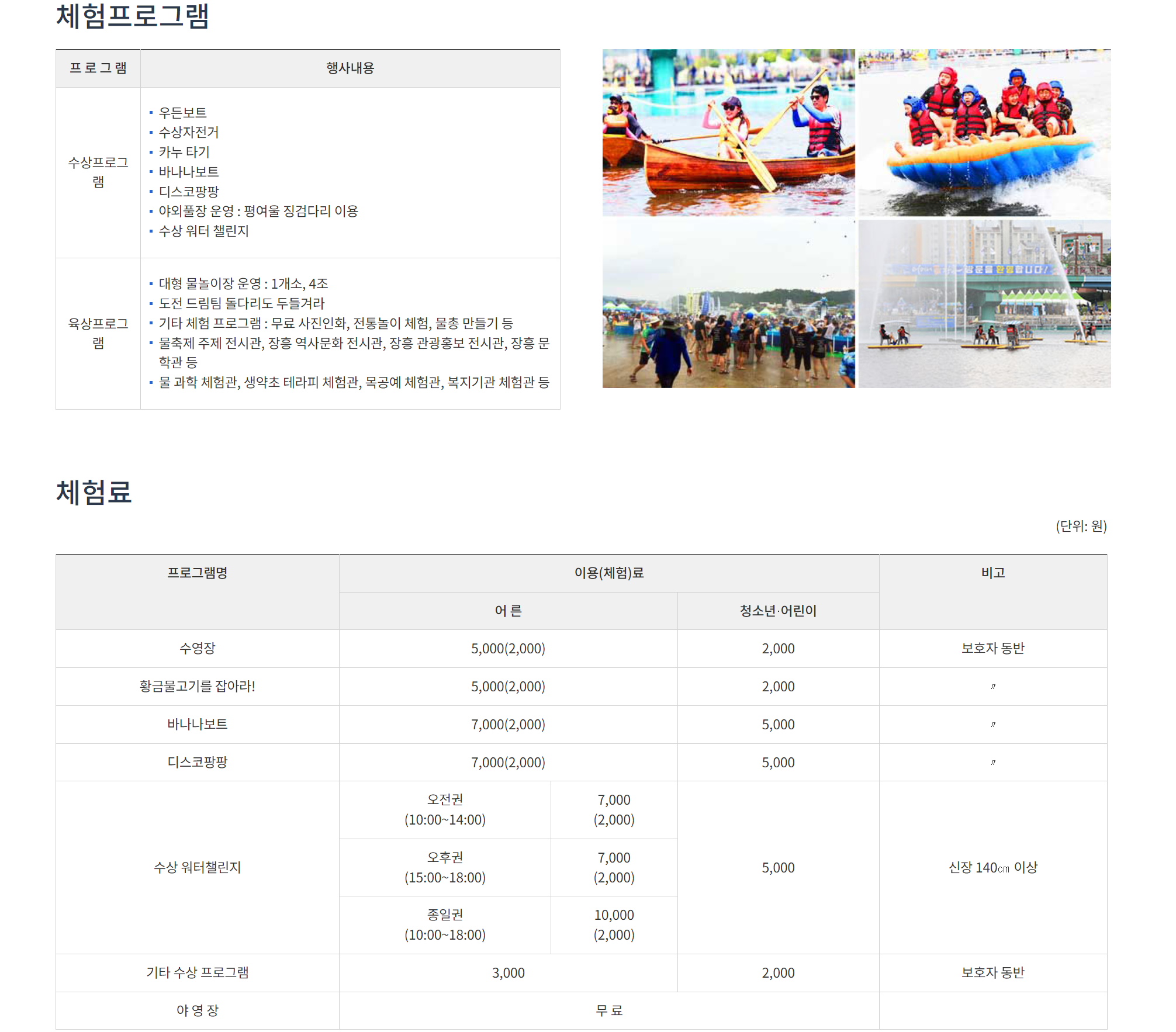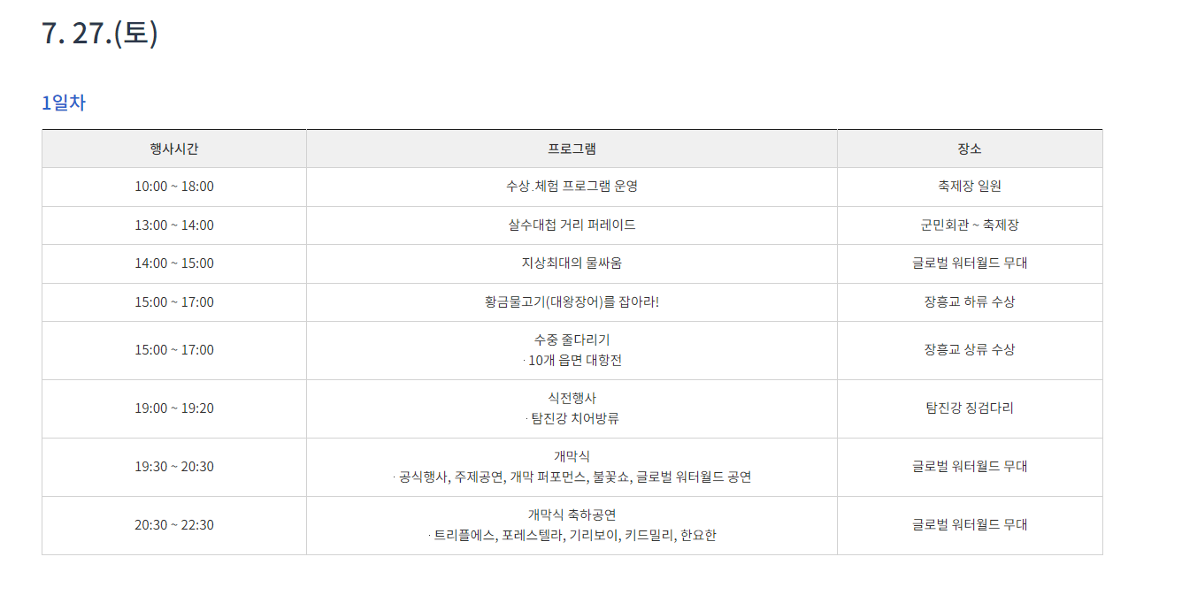 축제일정은 수상 체험 프로그램 운영 -> 물싸움 -> 황금물고기 잡기 -> 수중 줄다리기 -> 볼풀대전 ->음악축제 등의 순서로 날마다 변동이 조금씩 있긴 하지만 전반적인 내용은 비슷합니다.