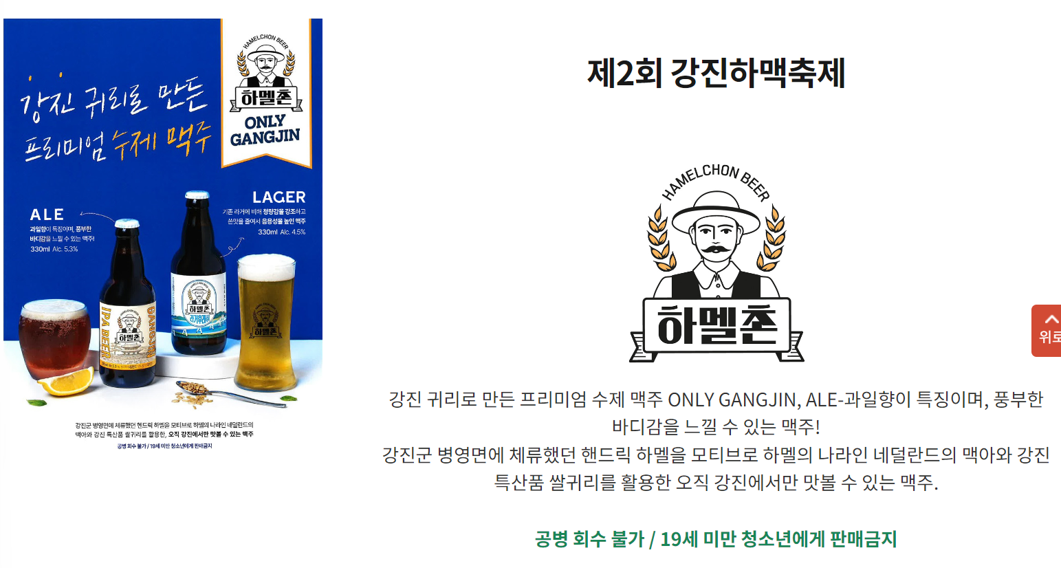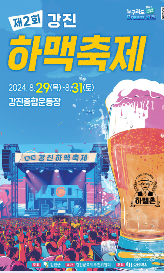 하맥축제는 네델란드의 홉과 강진의 쌀 귀리를 결합한 강진 고유맥주를 즐기자는 취지로 개최되는 축제입니다. 맥주를 1만원에 무제한으로 마실수 있고, 에일리, 노라조 축하 무대공연도 준비되어 흥을 돋울 예정이라고 합니다.