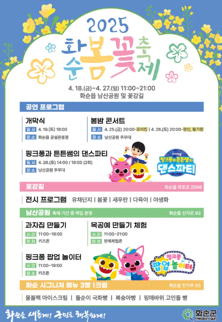 2025 화순 봄꽃 축제 아이와 함께 다녀온 후기 25.4.18일부터 화순 봄꽃 축제가 시작된 주말에 다녀왔는데요. 사실 핑크퐁 팝업 놀이터가 있다고 해서 아이와 함께 다녀왔어요. 화순 봄꽃 축제는 화