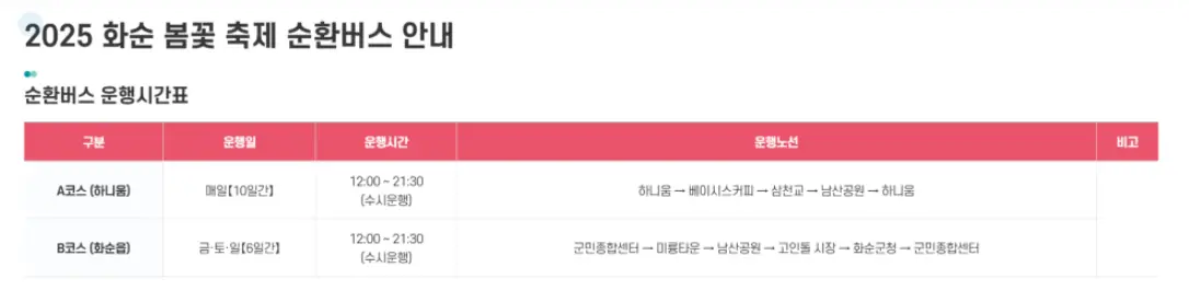 화순 봄꽃 축제 기간 동안 셔틀버스 운행 노선입니다.