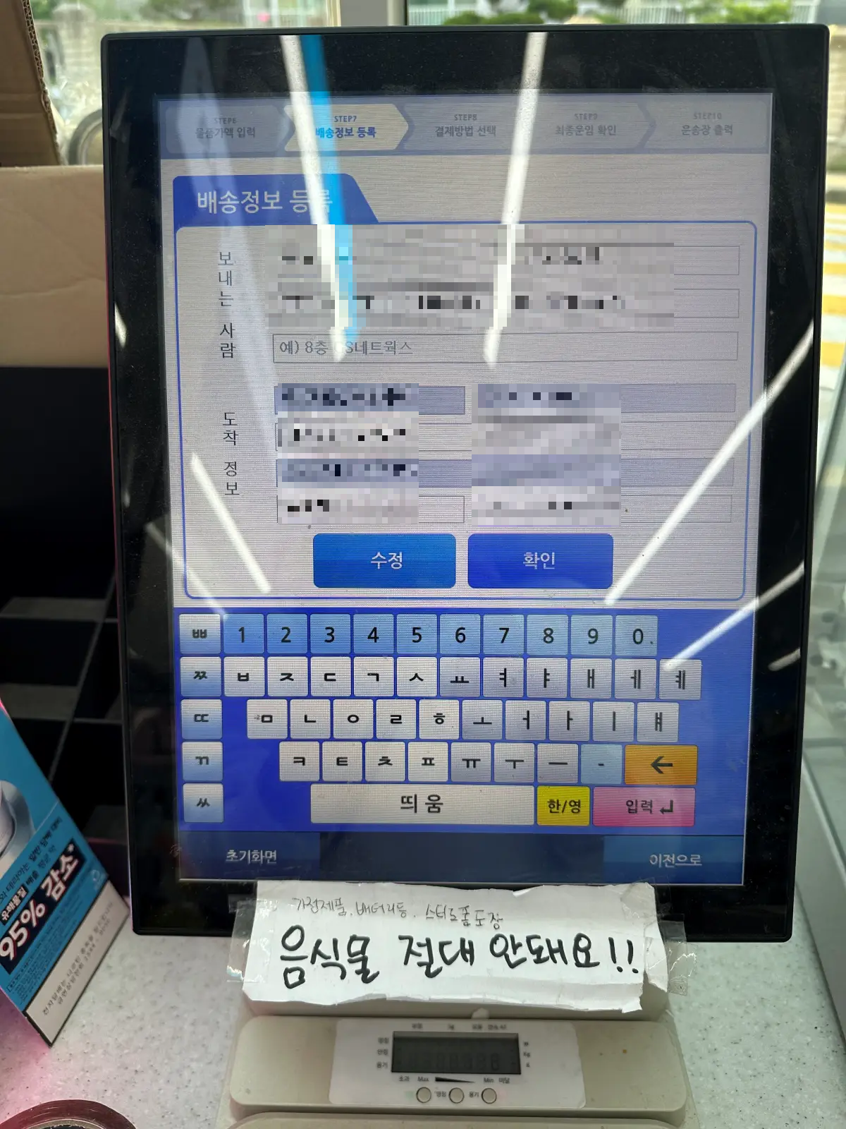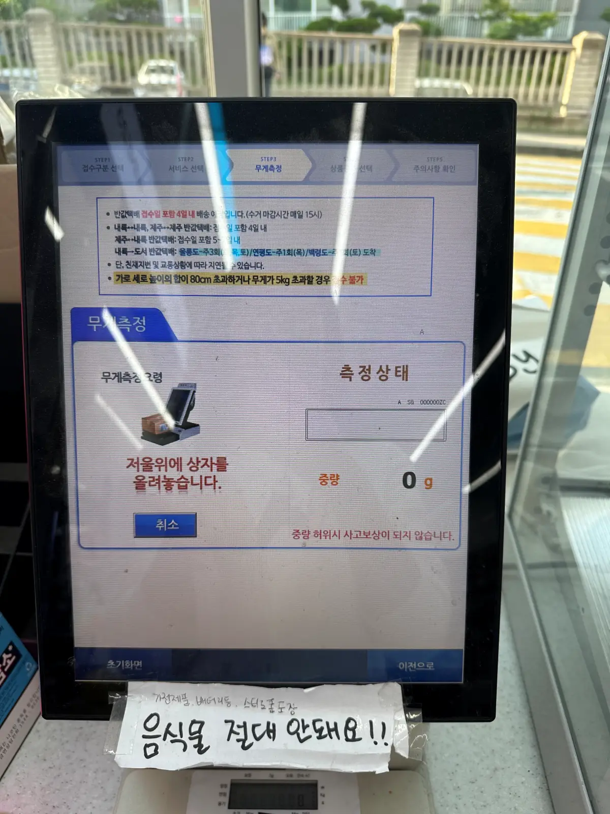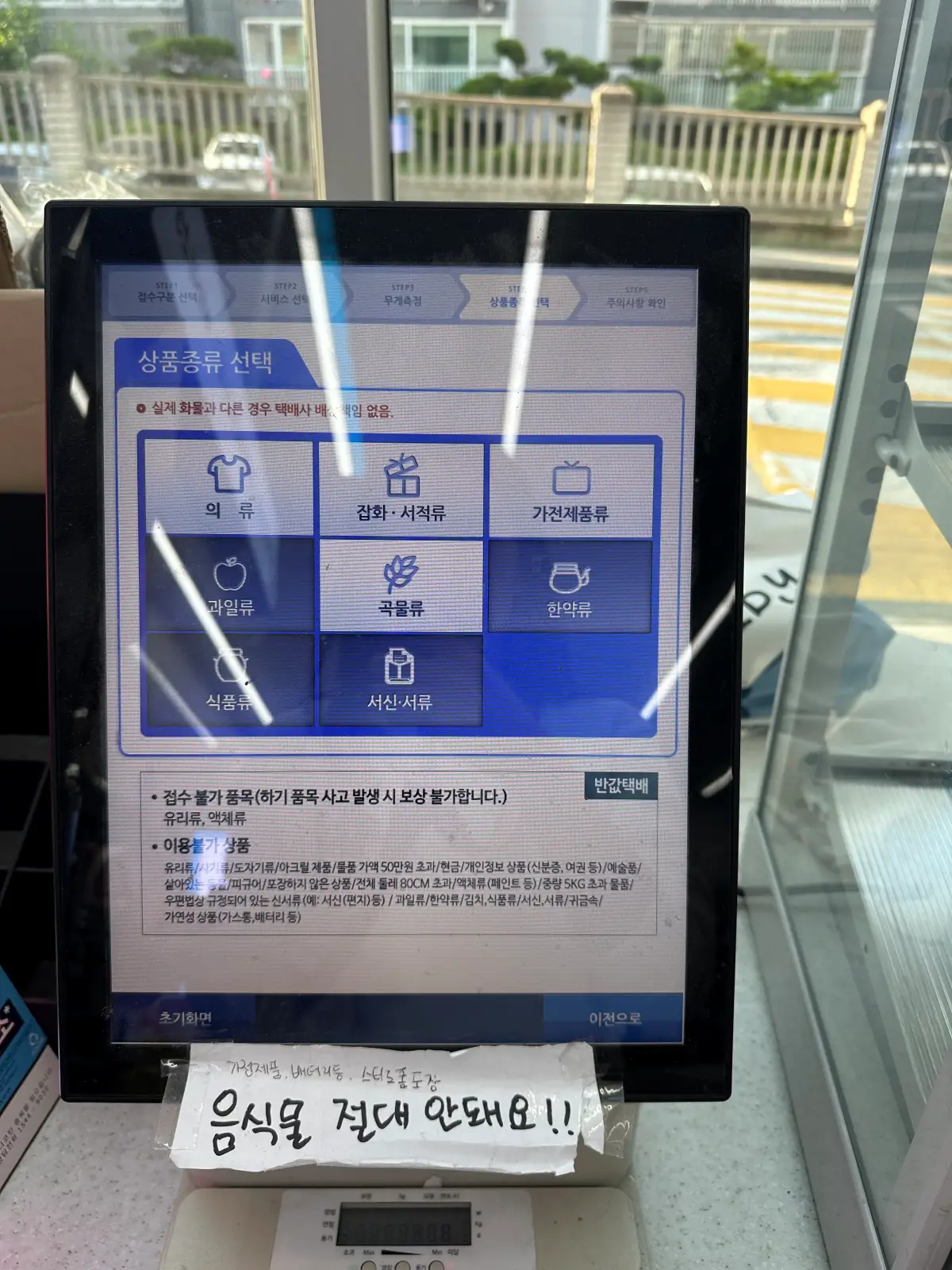 3. 가져온 물건을 저울에 올려두고 무게를 측정 후 물품 가액을 입력. 상품 종류를 선택.