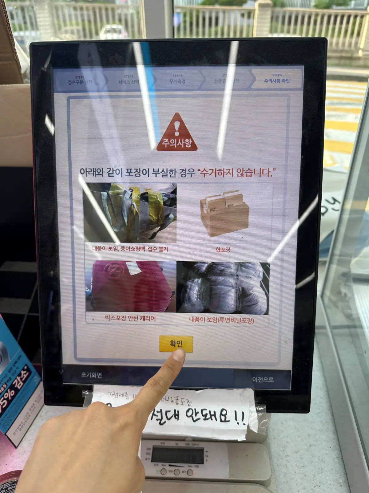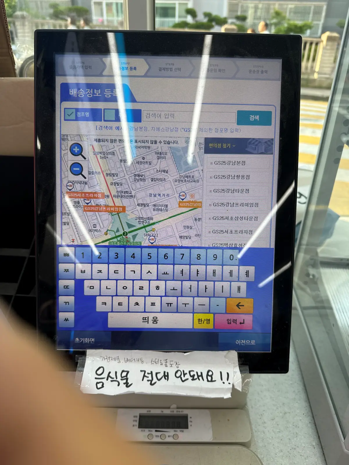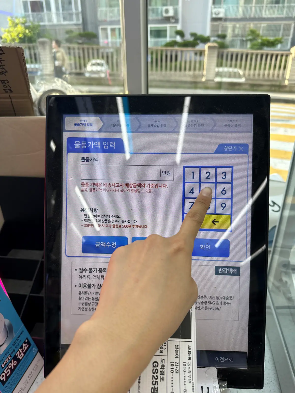 3. 가져온 물건을 저울에 올려두고 무게를 측정 후 물품 가액을 입력. 상품 종류를 선택.